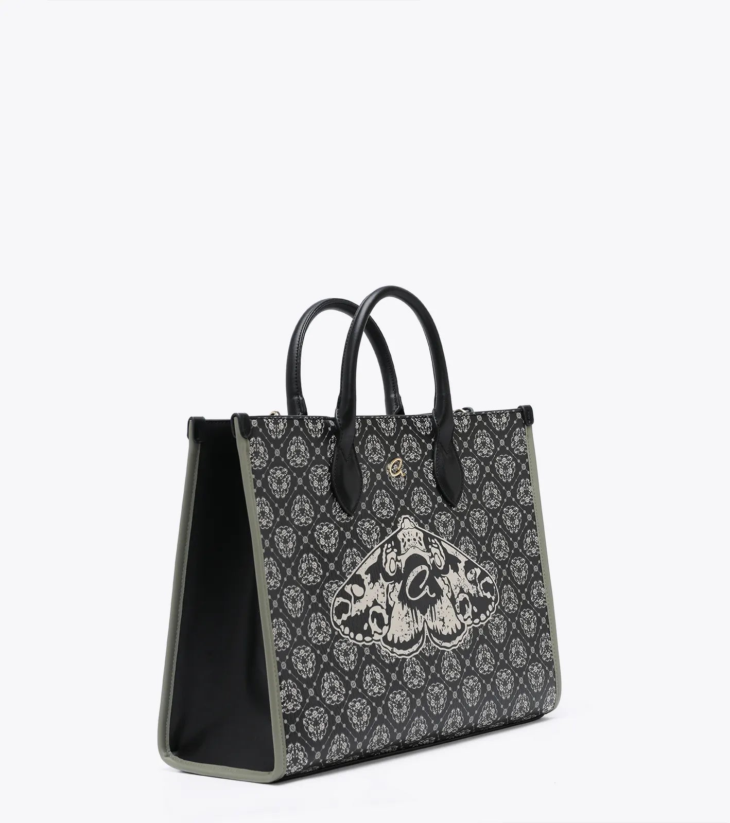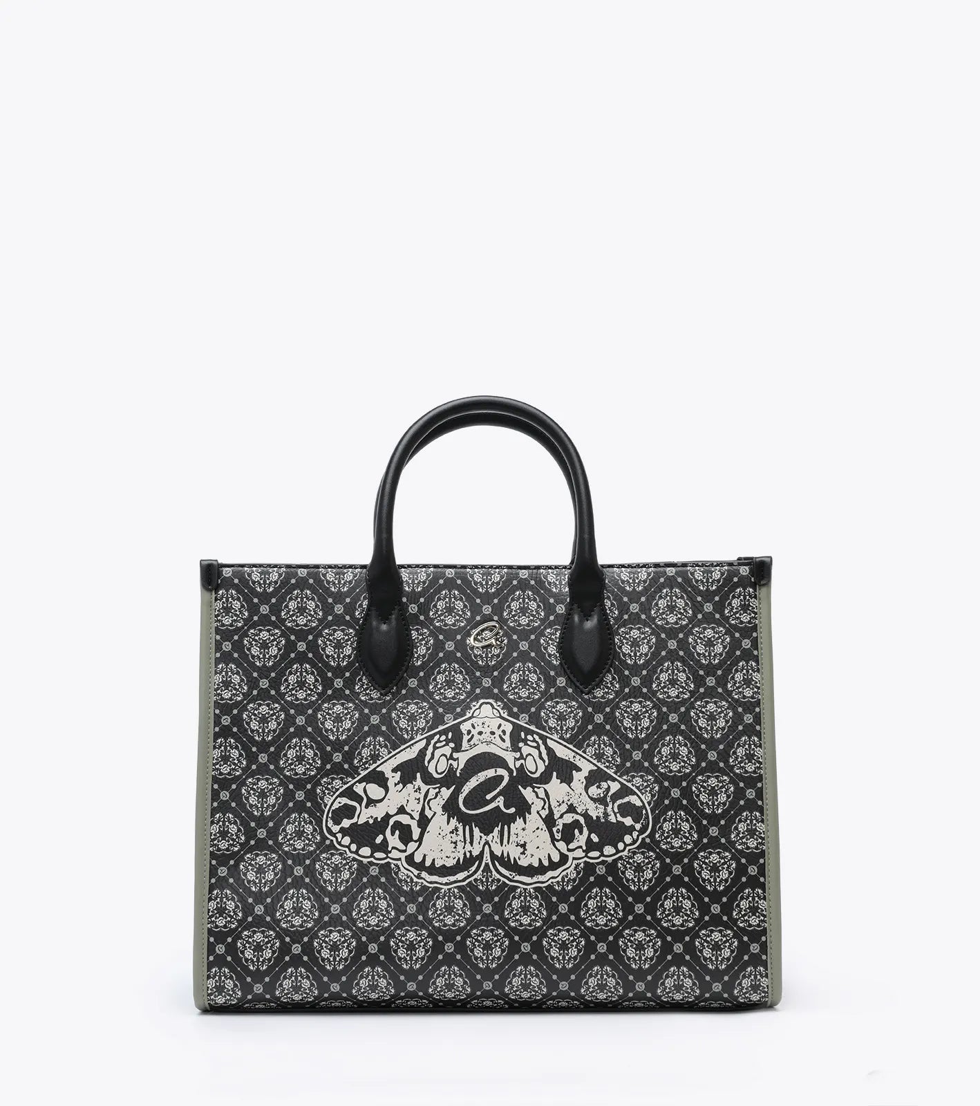Γυναικεία τσάντα χειρός Malin κατασκευασμένη από τεχνόδερμα υψηλής ποιότητας με όμορφο μοτίβο σε σχήμα πεταλούδας. Διαθέτει κράτημα με διπλά χερούλια και έξτρα αποσπώμενο λουράκι για να χρησιμοποιηθεί και ως χιαστί. Εσωτερικά περιέχει ανοιχτή θήκη για κινητό και τσέπη με φερμουάρ για οργάνωση μικρών αντικειμένων. Ασφαλίζει με φερμουάρ. Σχεδιασμένη σε μεγάλο μέγεθος με σταθερή δομή για να διευκολύνη και να εξυπηρετεί τις καθημερινές ανάγκες.